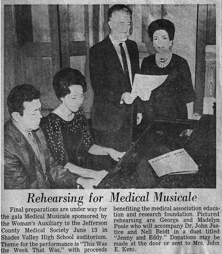 In the late 1950's she served as Music Director for WBRC-TV and was active in the Birmingham opera and theater community. In 1959 she was the understudy to Irene Jordan in the Birmingham Civic Opera's production of Verdi’s La Traviata. In 1960 she sang the role of Despina in the Civic Opera’s production of Mozart's Cosi Fan Tutti opposite John Brownlee of the Met.